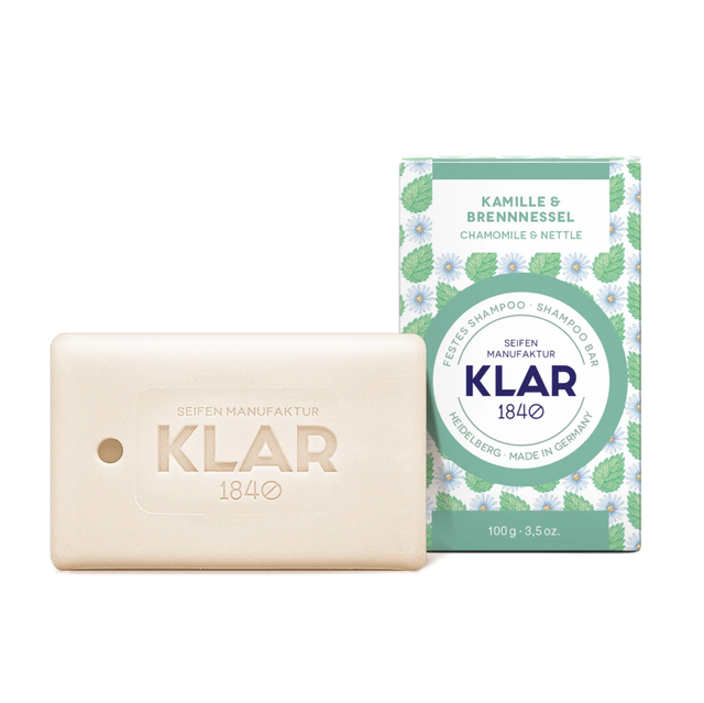 Klar's festes Shampoo Kamille & Brennnessel ist die Lösung, wenn Sie empfindlich auf herkömmliche Shampoos reagieren. Milde natürliche Kamille wirkt beruhigend auf juckende und empfindliche Kopfhaut. Das feste Shampoo ist ideal in Kombination mit dem festen Conditioner Kamille & Brennnessel.